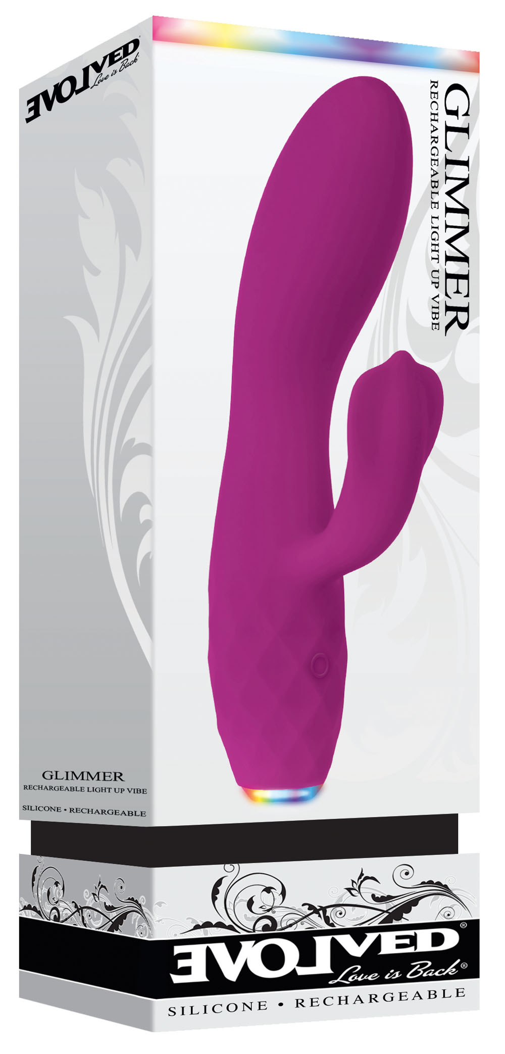 Find your bliss with this elegantly shaped toy, featuring a light-up base that glows with a new color for every function. Two powerful motors carry you away through seven vibrations of your choice as you build to a spectacular climax! The curves in each shaft are tailored for a woman’s body, and the waterproof, submersible design brings a whole new experience to bath and shower time! Clean with Evolved Toy Cleaner and a warm water rinse.