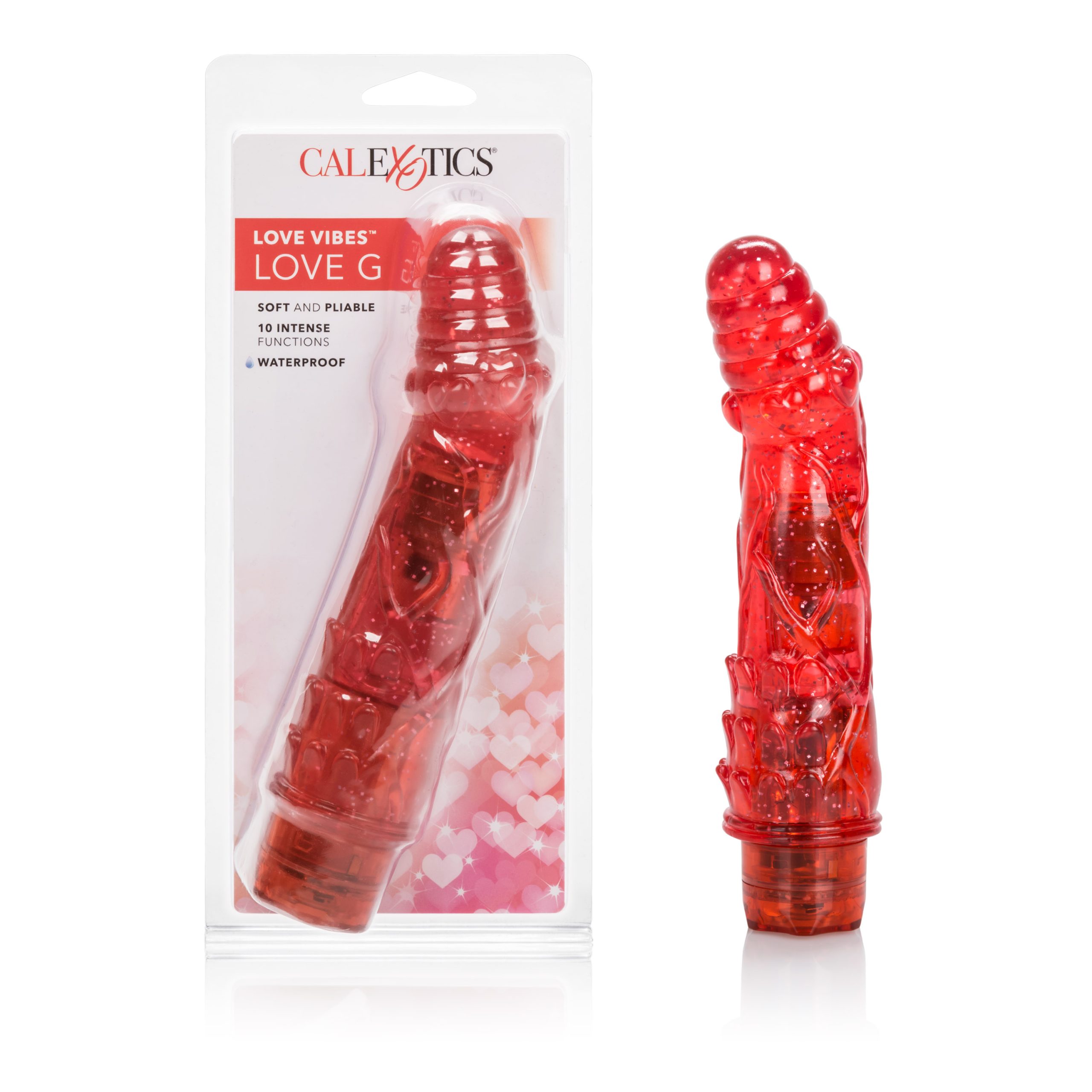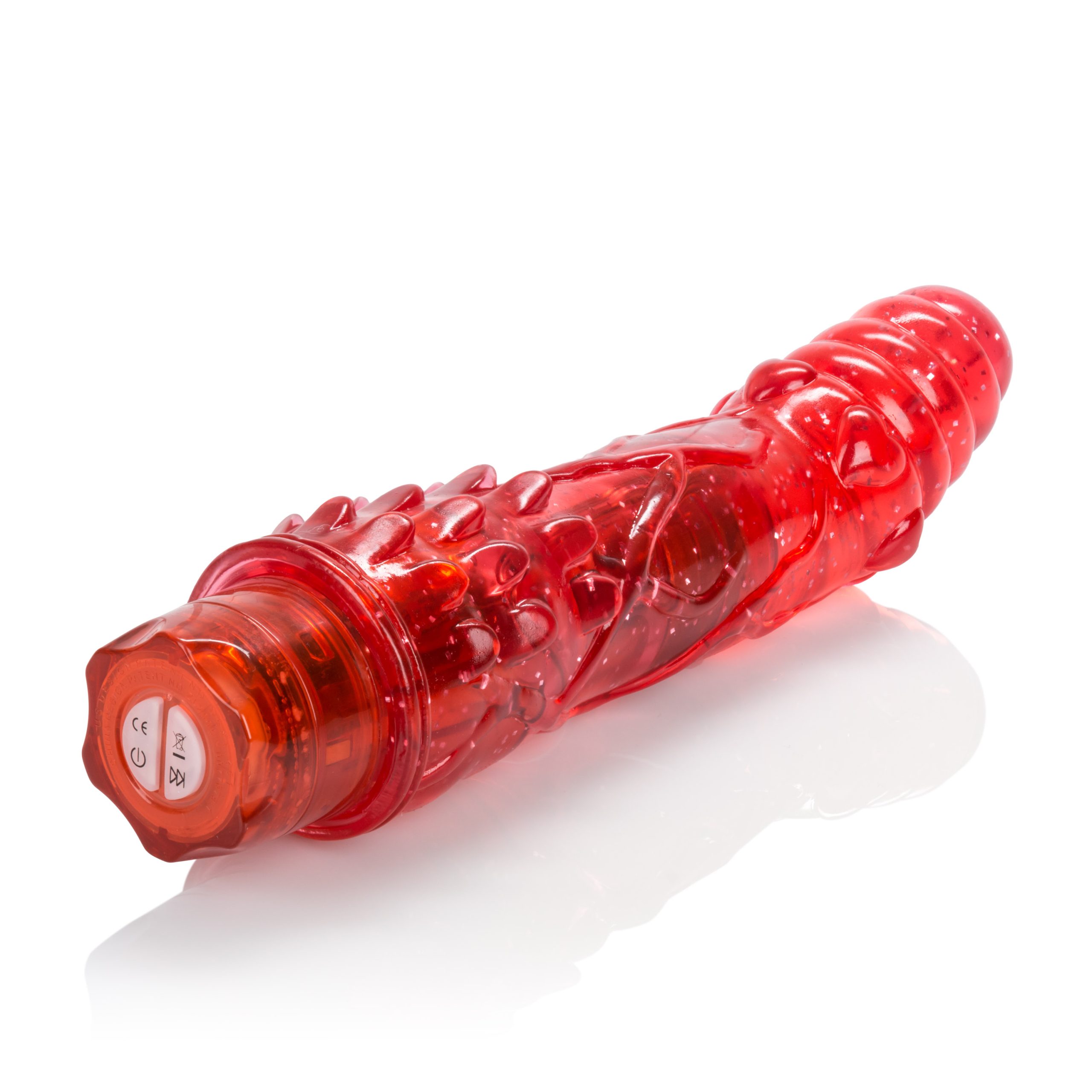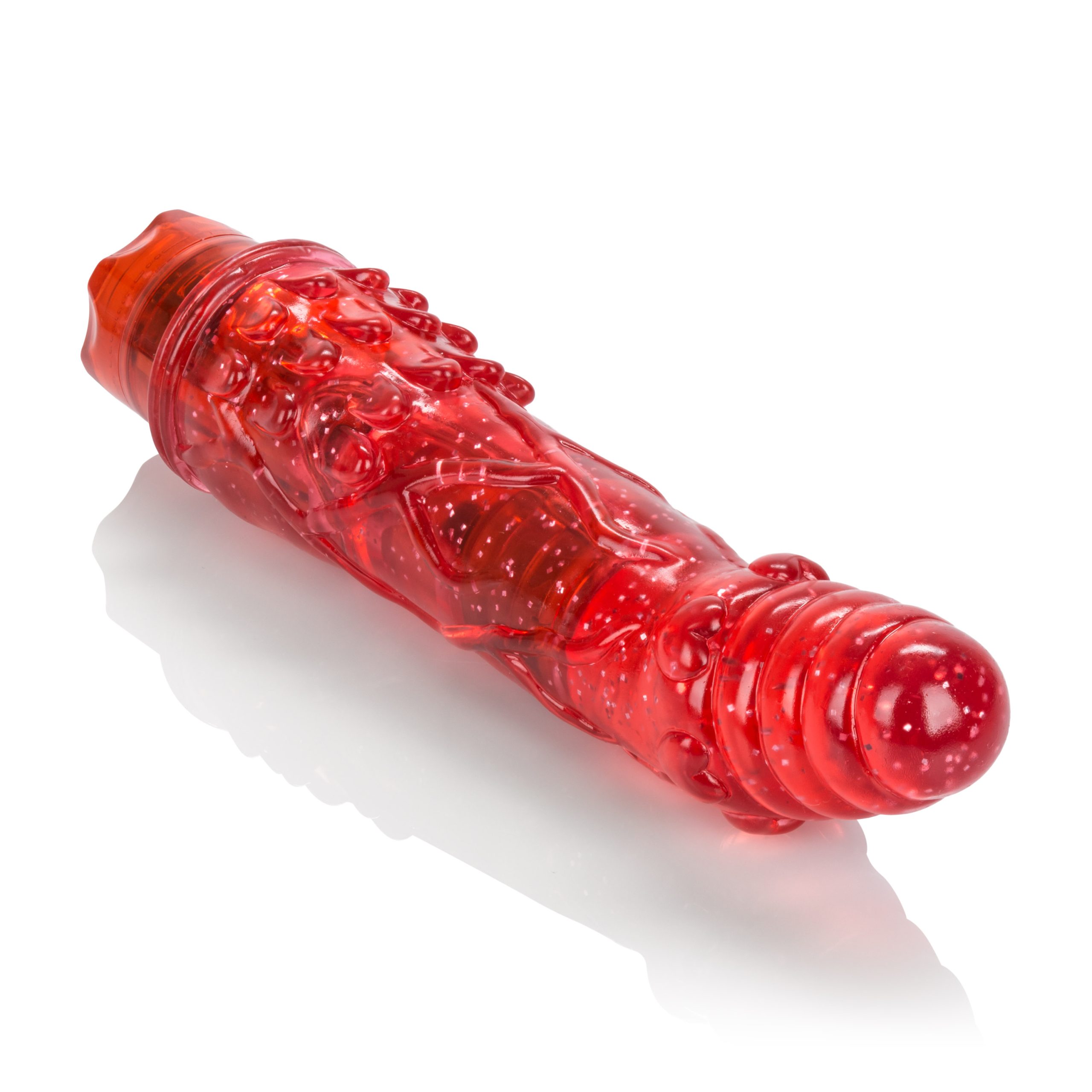 Hearts and glitter adorn this Jelly soft vibrator. State-of-the-art memory chip resumes function last used. 10 powerful functions of vibration pulsation and escalation.