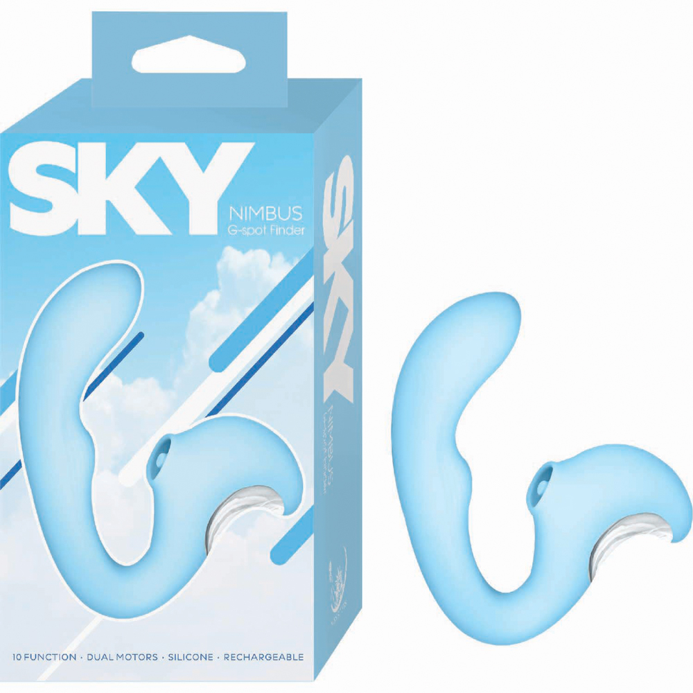 Meet the Nasstoys Sky Nimbus G Spot Finder, a thoughtfully engineered vibe designed to help you find and enjoy targeted internal and external stimulation with ease. This USB rechargeable toy features dual motors and 10 vibration functions, giving you a layered sensation that feels both powerful and controlled. The ergonomic, curved shape is easy to insert and positions the bulbous tip perfectly for G-spot or P-spot stimulation, while remaining backdoor safe for confident exploration. Its versatile design makes it a great option for users who enjoy experimenting with different angles, pressure, and pacing. What makes the Sky Nimbus stand out is the tapping external stimulator, designed in a soft cup shape that gently surrounds the clitoris for consistent contact and rhythmic sensation. Wrapped in silky smooth, body-safe silicone, it is quiet, splash-proof, and comfortable for extended play. For best performance charge fully before first use to help prime the battery, and pair with a water- based lubricant to enhance comfort and sensation. After each use, clean with toy cleaner or mild antibacterial hand soap, rinse thoroughly, and allow to dry completely before storing. Designed for precision and pleasure, this G-spot finder makes blended stimulation feel intuitive and approachable.