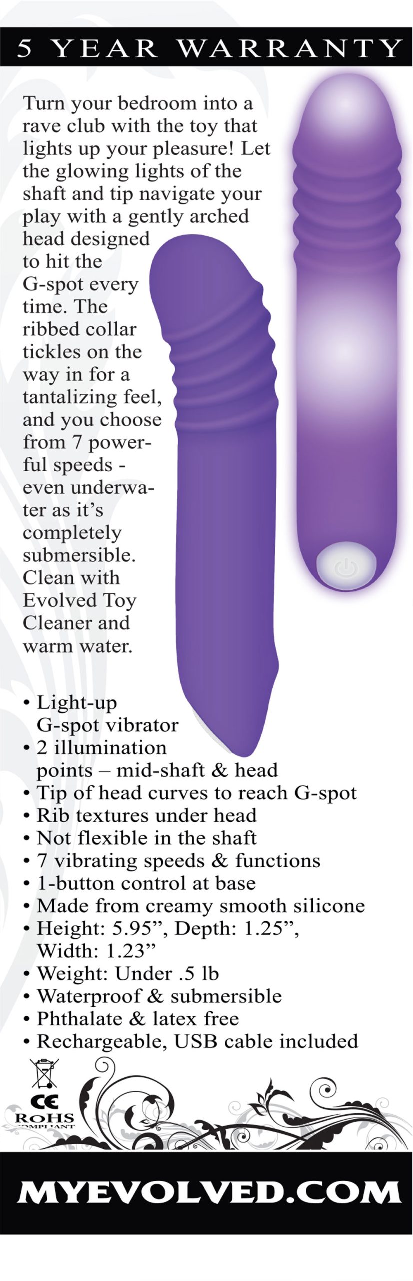 Turn your bedroom into a rave club with the toy that lights up your pleasure! Let the glowing lights of the shaft and tip navigate your play with a gently arched head designed to hit the G-spot everytime. The ribbed collar tickles on the way in for a tantalizing feel, and you choose from 7 powerful speeds even underwater as its completely submersible.