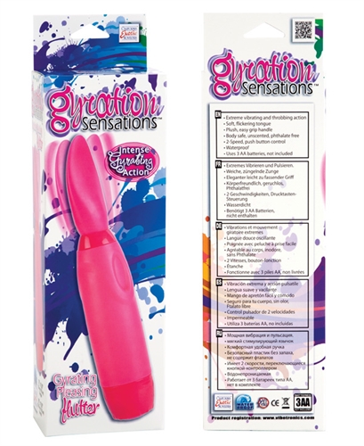 Unlimited erotic tingles are yours to enjoy with the Gyration Sensations Flutter. The tantalizing, powerful tongue-shaped stimulator is designed for use anywhere on the body and boasts intense clitoral and labial stimulation. For a memorable intimate time, this plushy soft vibrating and gyrating action vibe is the one for you.