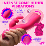 The gyrating G-spot tip is curved to seek and maintain contact with the anterior vaginal wall throughout use. Three rows of rotating metal beads run along the 4.2″ insertable shaft and massage the vaginal walls continuously during operation, layering a rolling internal sensation over the tip gyration that vibration alone cannot replicate. The firm dual bunny ears position directly against the clitoris and the clitoral bullet delivers pinpoint vibration to the external nerve cluster simultaneously. Full dual stimulation: both channels on, both working, independently controlled.