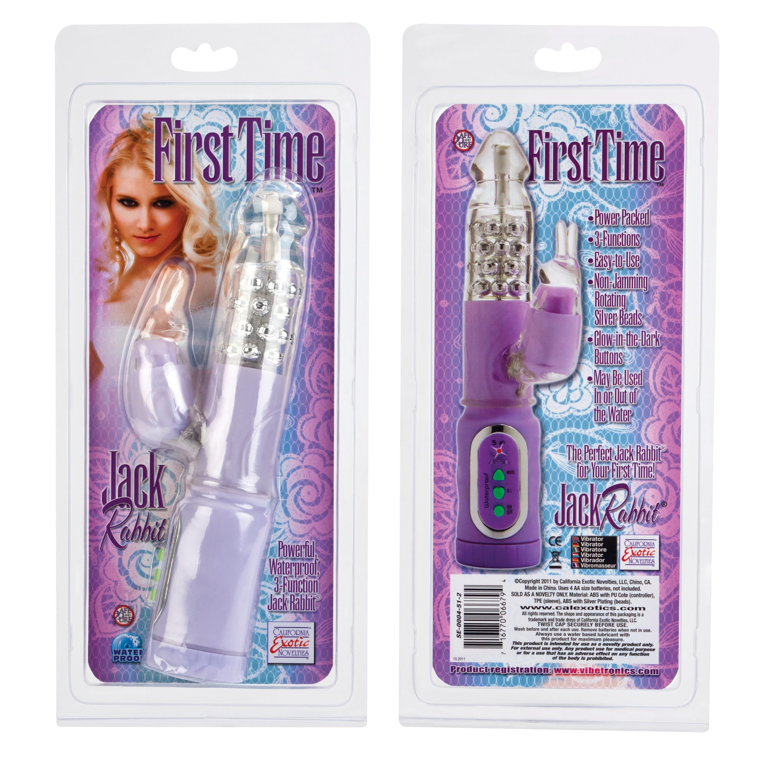 The perfect Jack rabbit for the first time. 3 powerful functions of bunny vibrations. Reversible non-jamming rotation silver pleasure beads. Glow in the dark push controls. EZ load battery pack. Make it a memorable experience with the first time collection.