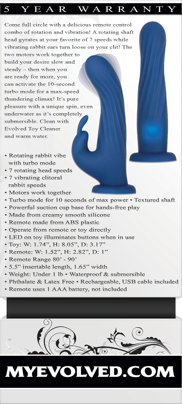 Come full circle with a delicious remote control combo of rotation and vibration! A rotating shaft head gyrates at your favorite of 7 speeds while vibrating rabbit ears turn loose on your clit! The two motors work together to build your desire slow and steady – then when you are ready for more, you can activate the 10-second turbo mode for a max-speed thundering climax! It’s pure pleasure with a unique spin, even underwater as it’s completely submersible. Clean with Evolved Toy Cleaner and warm water.