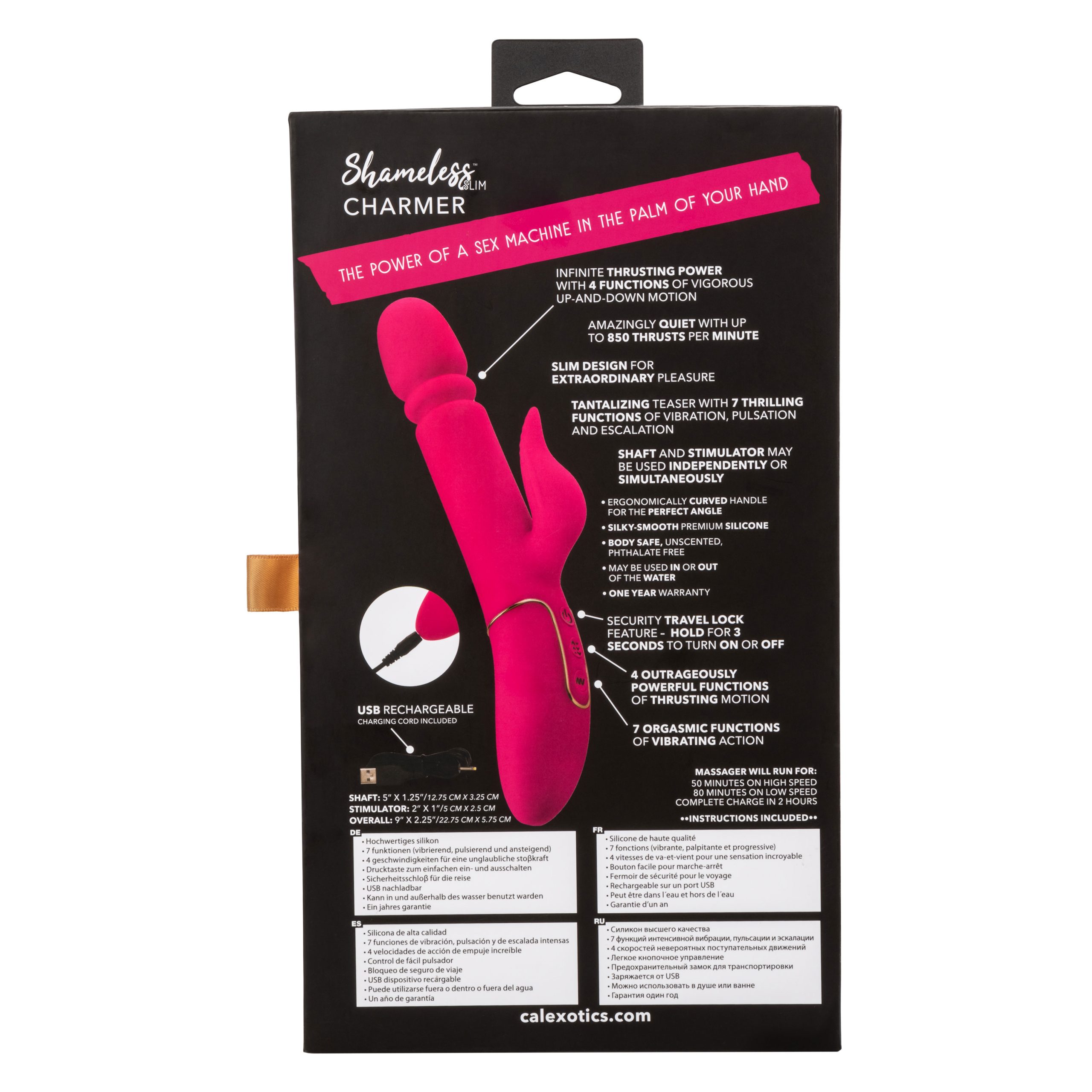 There is no shame in this game! Experience all the thrusting pleasure you crave with this Charmer. It features 4 functions of vigorous up-and-down motion and is made with body-safe silicone that feels amazing on the skin. Not only does this massager thrust, it also vibrates with 7 different functions to choose from. The teaser flickers to hit all your hot spots. Plus, the thruster and vibrator are controlled independent, so you can customize the fun any way you like it.