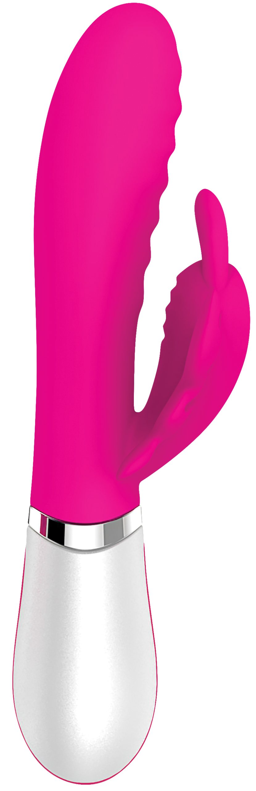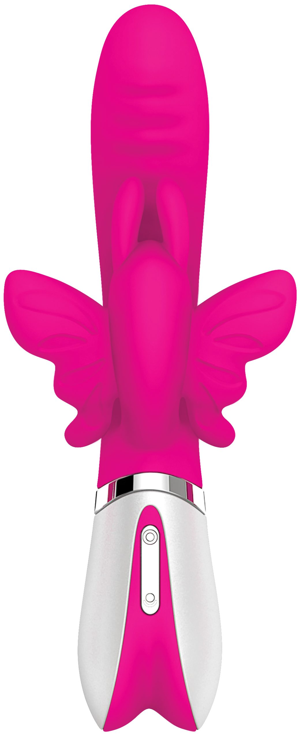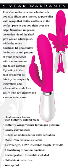 This dual motor silicone vibrator lets you take flight on a journey to pure bliss with wings that flutter and buzz at the perfect pace to put you right over the edge. Sensation ridges on the underside of the shaft give you an added push, while the seven functions let you control the intensity and pattern of your experience with a no-nonsense one-touch control. Fly safely in the bath or shower as this toy is completely waterproof and submersible, and clean easily with toy cleaner and a warm water rinse.