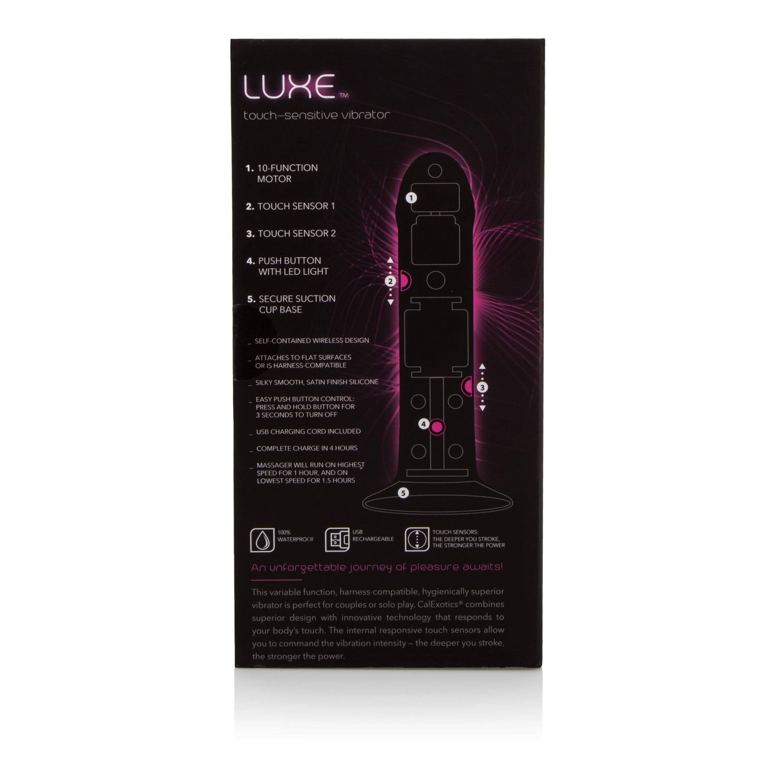This variable function, harness-compatible, hygienically superior vibrator is perfect for couples or solo play. CalExotics combines superior design with innovative technology that responds to your body’s touch. The internal responsive touch sensors allow you to command the vibration intensity – the deeper you stroke, the stronger the power.