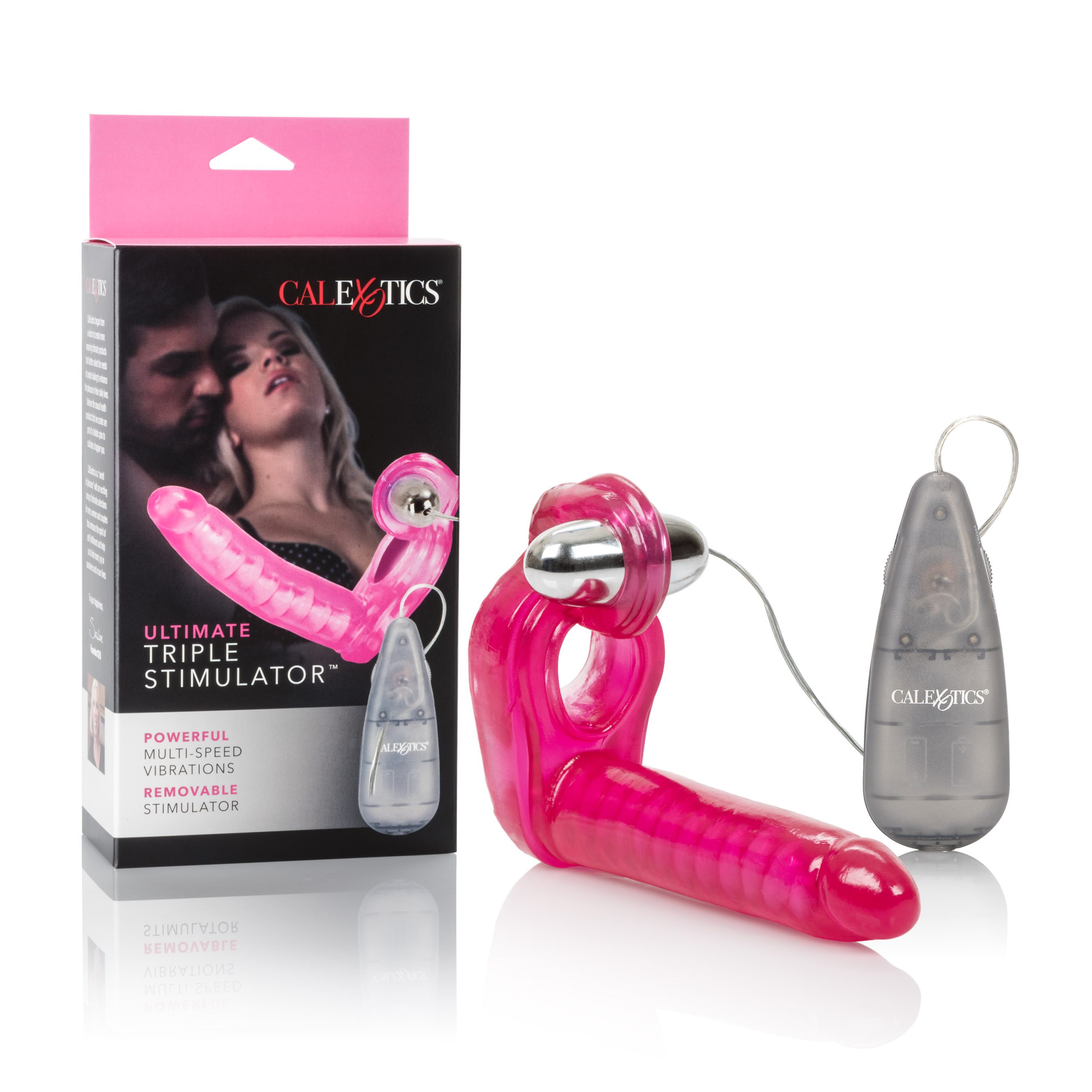 Increase and maximize your intimate pleasure with the Ultimate Triple Stimulator. The erotic and exotic couple’s enhancer delivers intensely satisfying ecstasy for him and her. The supportive penis ring boasts triple contact action that stimulates your every desire. Enjoy the ultimate DP experience without inviting a new friend to join in! The easy to use set comprises of a sturdy and soft, unscented phthalate free PVC support ring with a contoured clitoral teaser, and an attached flexible vertebrae dong. The arouser simultaneously delivers intensely pleasurable clitoral stimulation thrills and an orgasmic double penetration experience. The enhancer also includes a vibrating multi-speed bullet, with cord attached power pack. The stimulator provides optimal stamina support for enhanced erection maintenance and a rock hard performance every time. The flexible sensually textured penis shaped dong maximizes and doubles the pleasure for a heightened amorous encounter. The removable bullet can also be used to arouse and stimulate red-hot erogenous zones and super sensitive sweet spots all over the body. To increase the satisfaction even further, always use a quality lube with this toy.