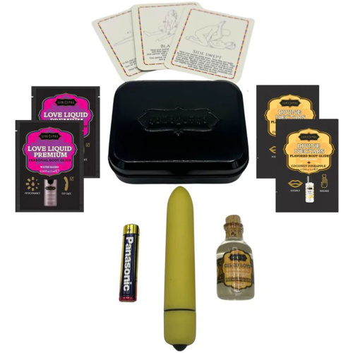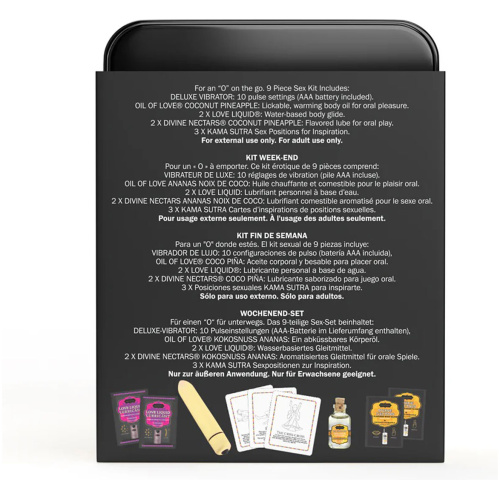 The all new Vibe Weekender Kit is here! Be ready for spontaneous fun with the perfect mix of Kama Sutra luxuries and a battery powered mini vibe with 10 vibration settings. Perfect portions fit comfortably in a pocket, luggage, bag or purse for a weekend away or anytime the mood strikes.